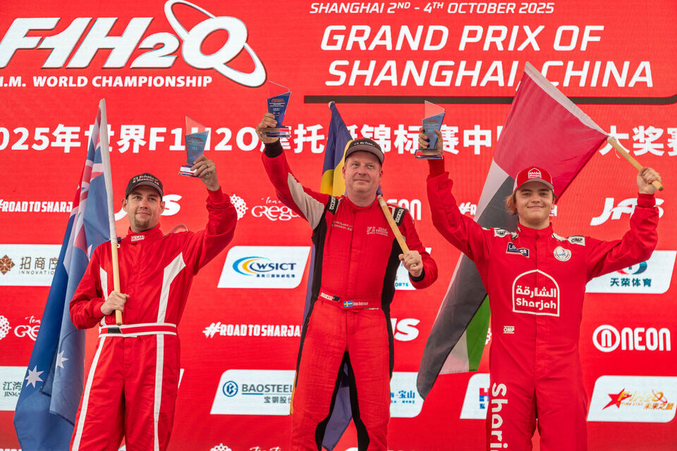 Friday, October 3: Team Sweden’s Jonas Andersson climbed from third at the start to secure victory for Team Sweden in the opening 18-lap Sprint race at the UIM F1H2O Grand Prix of Shanghai, China on the Huangpu River on Friday afternoon.