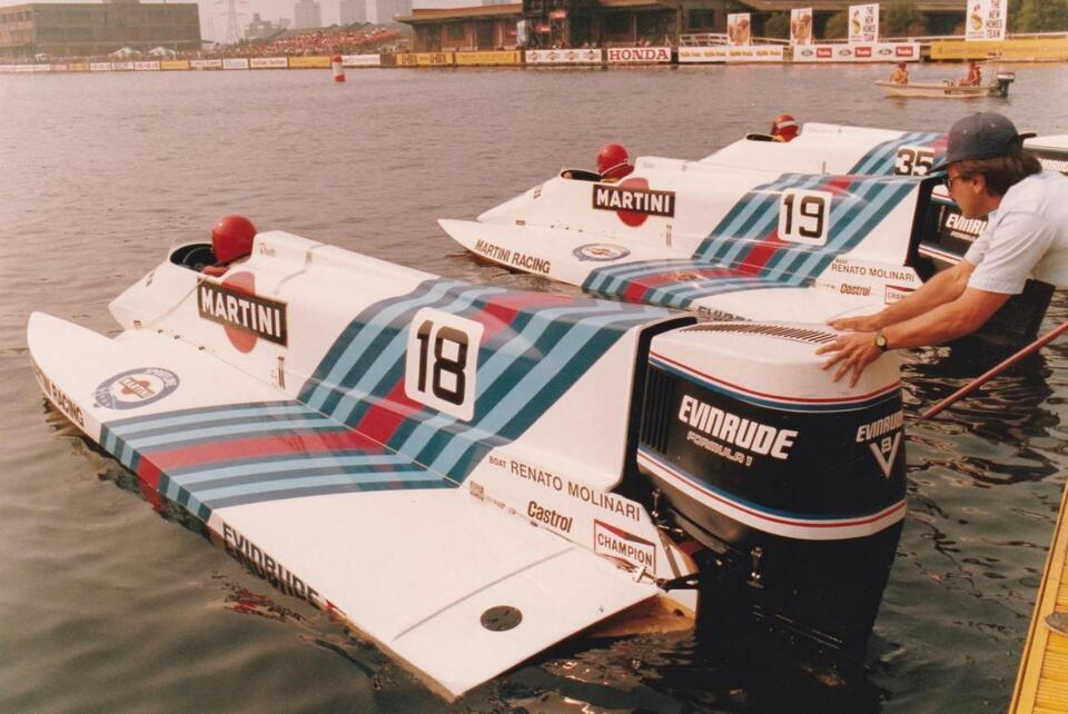 In addition to success in what is now the F1H2O series, Renato earned four world titles in the O-Unlimited series between 1980 and 1983 and five in the ON 200cc class in 1970, 1971, 1973, 1976 and 1980. In addition, he secured a pair of O-850 outboard titles in 1976 and 1979, the outboard O-1500 Corsa Championship title in 1977 and in the inboard Corsa 2000 in 1981. In his heyday in the F1 World Powerboat Championship, Molinari’s boats had Martini branding alongside his late team-mates Bob Spalding and Enrico ‘Chicco’ Vidoli.