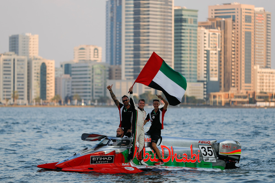 Saturday, 15 December, SHARJAH (UAE): Team Abu Dhabi’s Erik Stark drove a faultless race to win the Grand Prix of Sharjah but all the attention was focussed on teammate Shaun Torrente who took the chequered flag in third place to win the UIM F1H2O World Championship for the first time. “What a race. What a restart. I was fighting my mind trying to keep it all together. I was just managing my race. I knew I was in a good spot. I was just trying to get it home. I got a run on the restart on Sami (Selio) and I just let it hang. Thankfully it didn’t blow over. I knew I was there. I knew I was safe in fourth if it stayed like that. It’s all done now. I couldn’t take another day like that!”