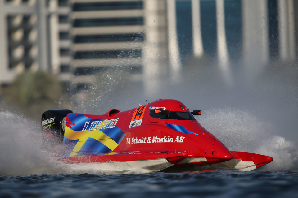 Abu Dhabi Pole-sitter and race winner Jonas Andersson pumped out the only sub 46 second lap of the session in the boat he refers to as the old lady saying “she is fast but ugly!” to top the time sheets with a 45.97, with Alex Carella, teammates Ahmed Al Hameli and Erik Stark and last year’s Sharjah race winner Marit Stromoy separated by 0.08 of a second. “It is so tight out there. These days there is really nothing to separate us. You can overtake here, but it is tricky so it is so important to get into Q3.” said Stark.